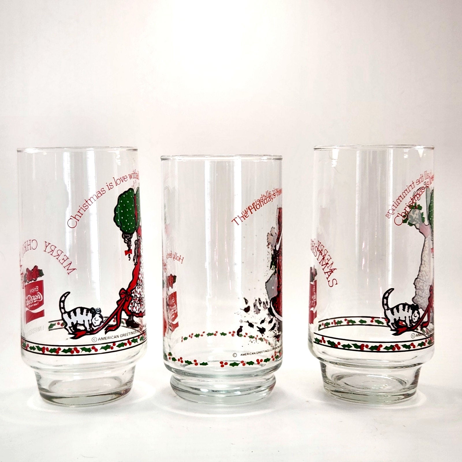 Celebrate the nostalgia of the holidays with this charming set of 3 vintage Holly Hobbie Christmas glasses, produced in collaboration between American Greetings Corp. and Coca-Cola in 1981.