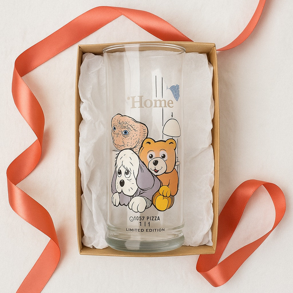 Step back into the magic of the 80s with this vintage 1982 E.T. the Extra-Terrestrial glass from the Pizza Hut Limited Edition Collector’s Series. Featuring the beloved E.T. peeking out from a pile of stuffed animals, this nostalgic piece was released by Universal Studios to celebrate the iconic Steven Spielberg film. Bring home a piece of movie and fast-food history — this E.T. collector’s glass is a charming reminder of one of cinema’s most heartwarming adventures.