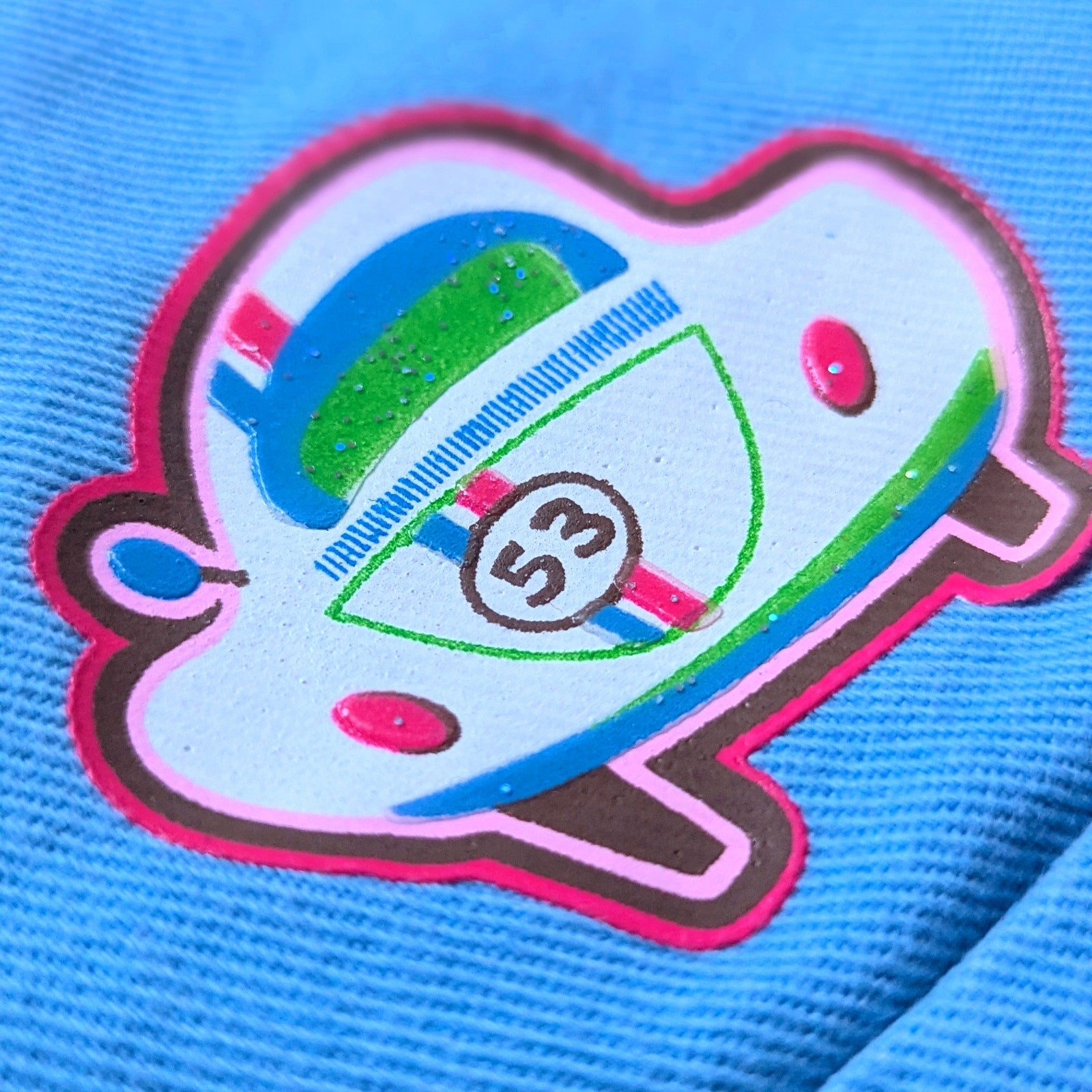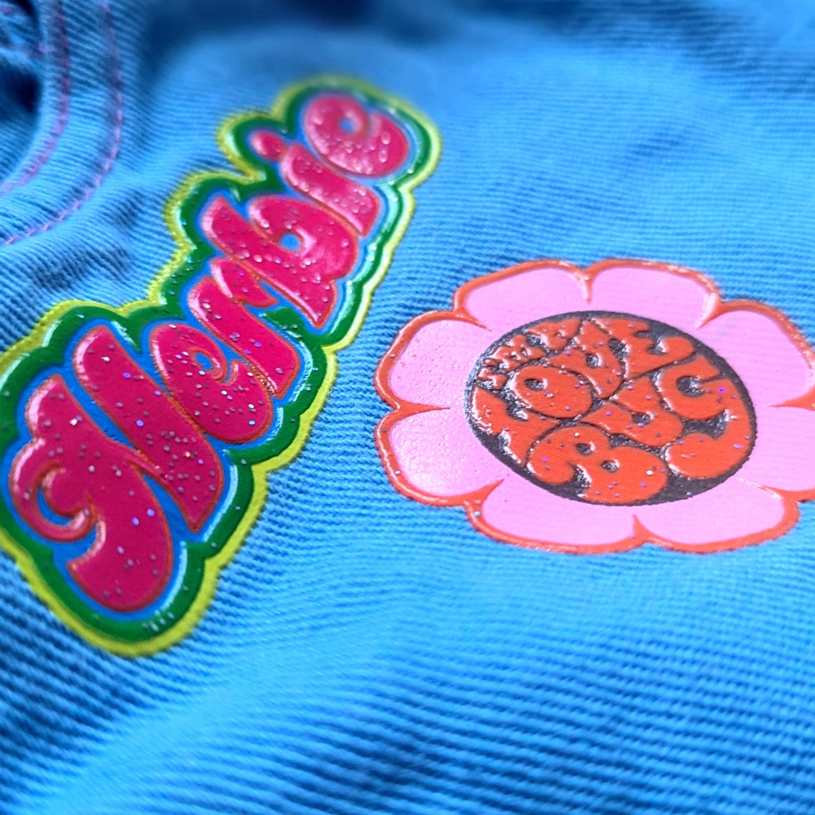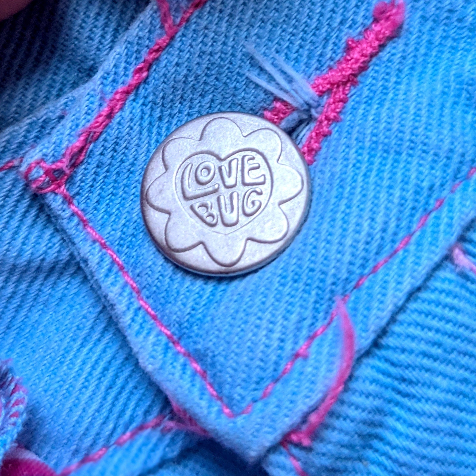 Step back into Y2K nostalgia with these Vintage 2005 Disney Herbie Fully Loaded Pants in Girls Size 7/8 (Medium). Made from 100% cotton twill, these blue cuffed pants feature bright, neon Flower Power decals with “Love Bug,” hearts, and Herbie’s signature car (#53). A fun, removable striped scarf belt adds a playful retro touch. Sold in mid 2000s at a Disney Parks.