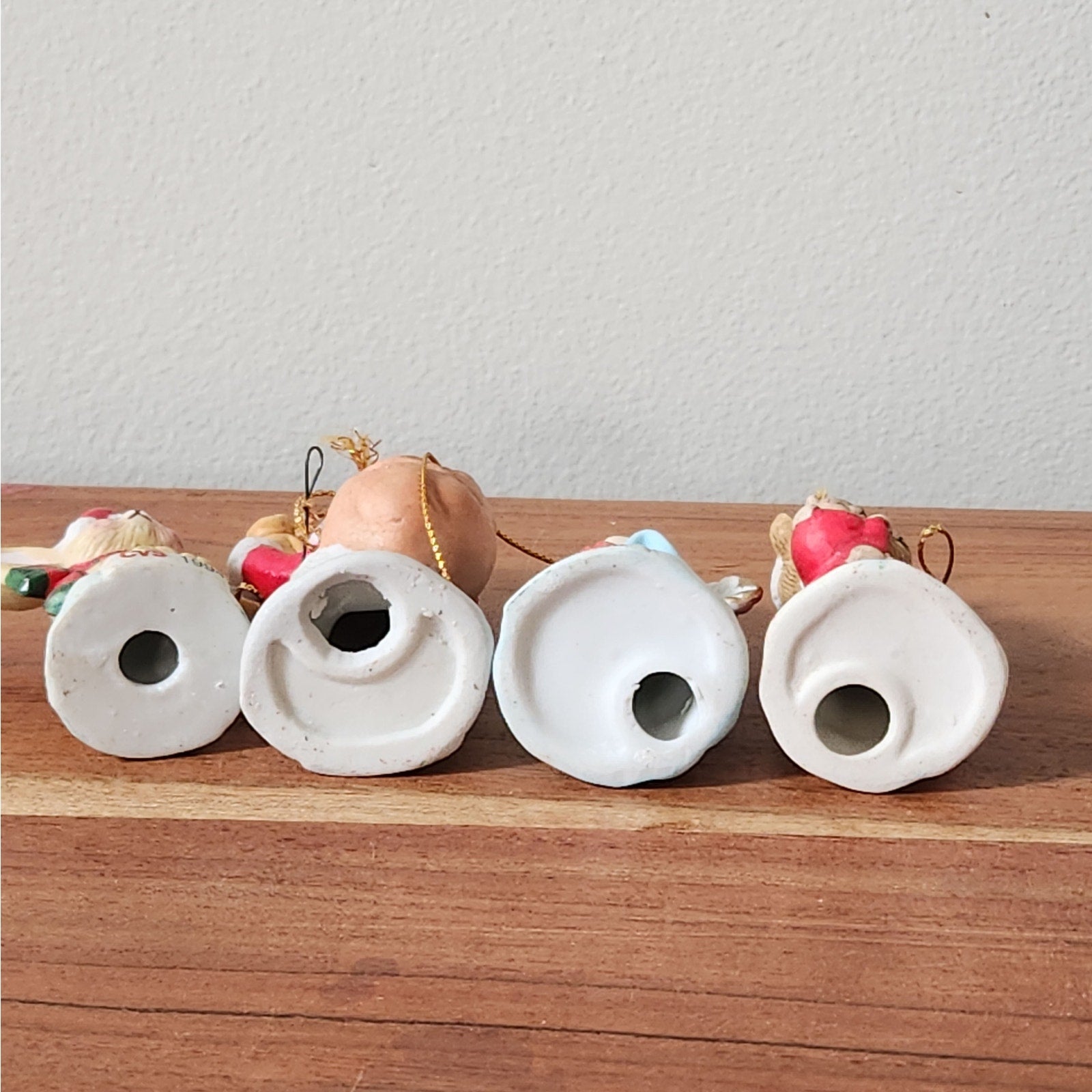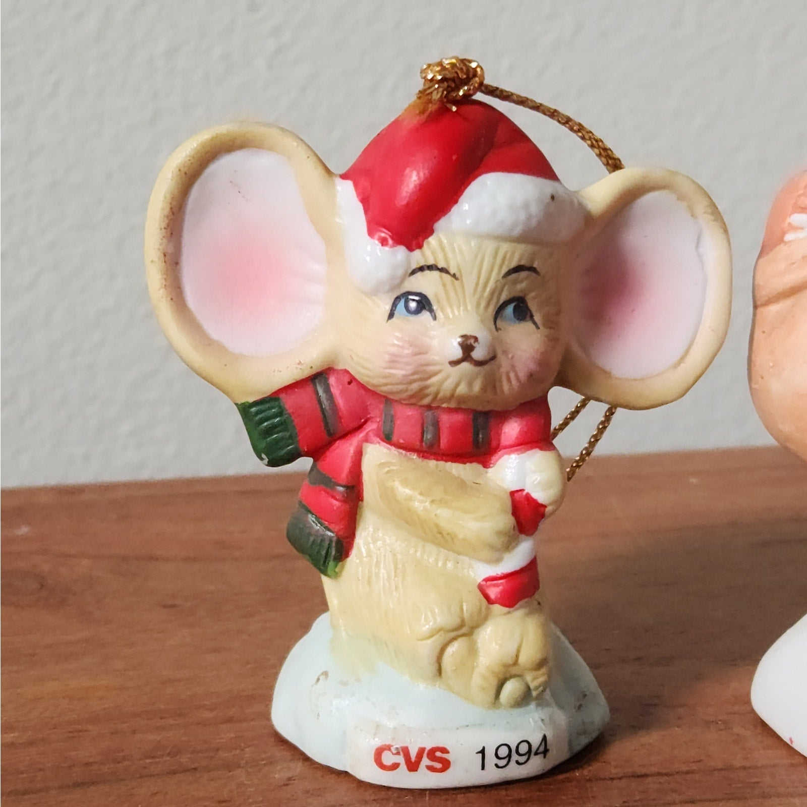 A complete four-piece set of nostalgic 1990s CVS porcelain Christmas ornaments—mouse, Santa, angel, and bear.