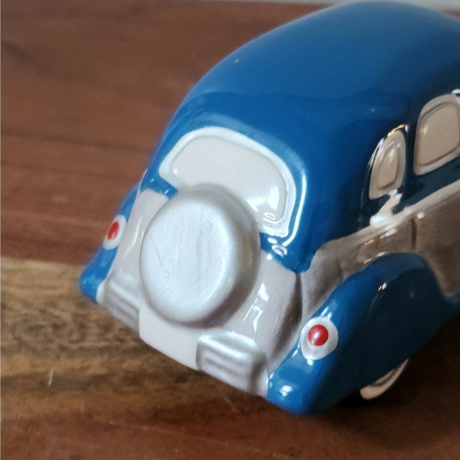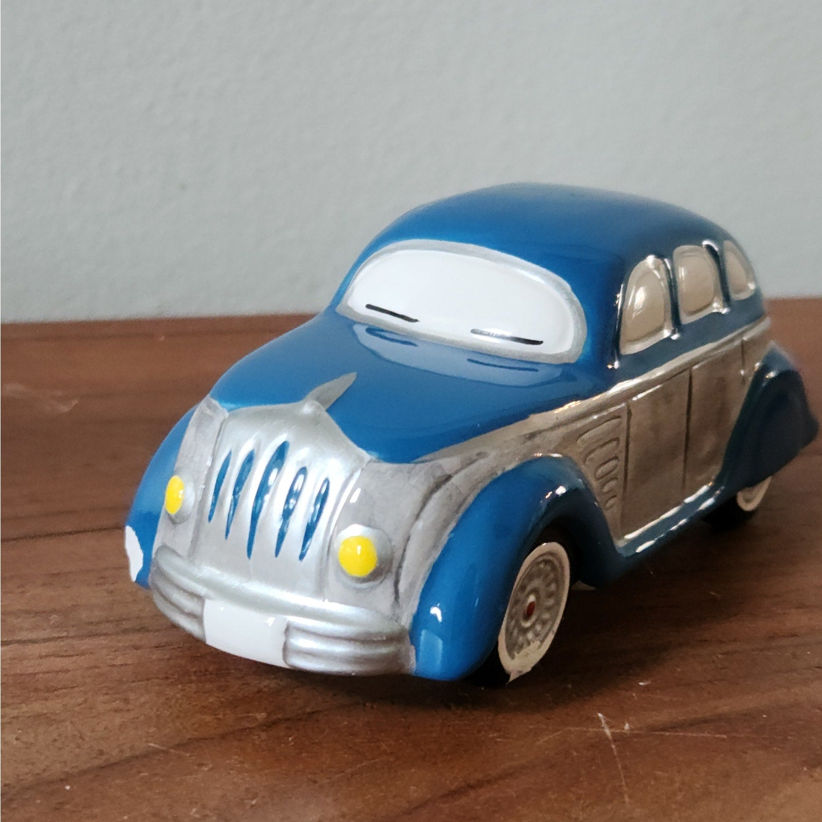 Surprise! The original school bus is missing, replaced by a blue and silver sedan, part of "The Original Snow Village" collection's "Classic Cars" set from 1993. It has a rounded body and nostalgic style.