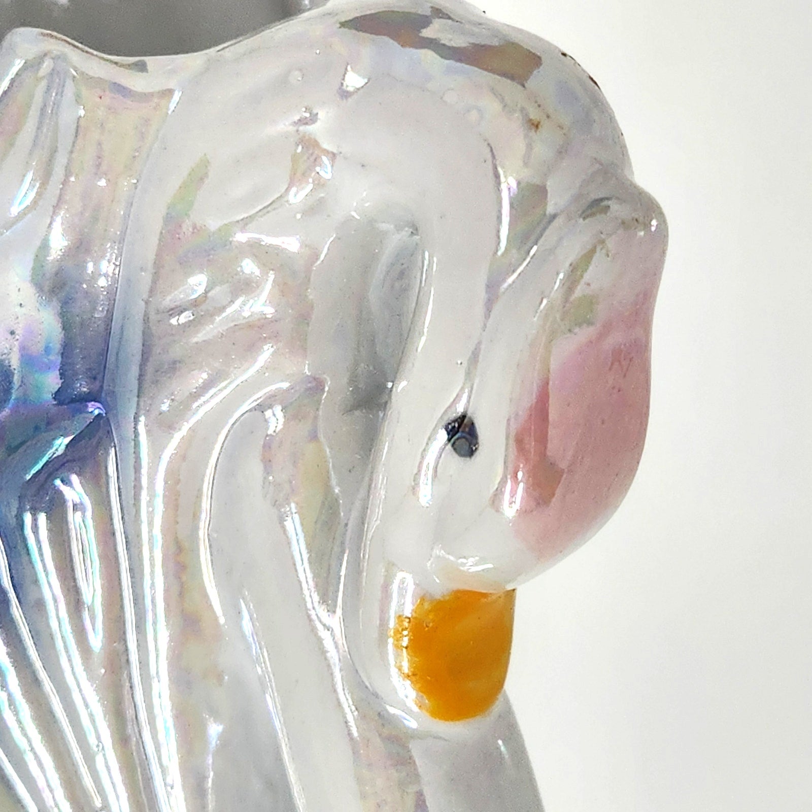 Vintage MCM Swan Vase – Iridescent Ceramic Swan Planter with Pastel Flowers