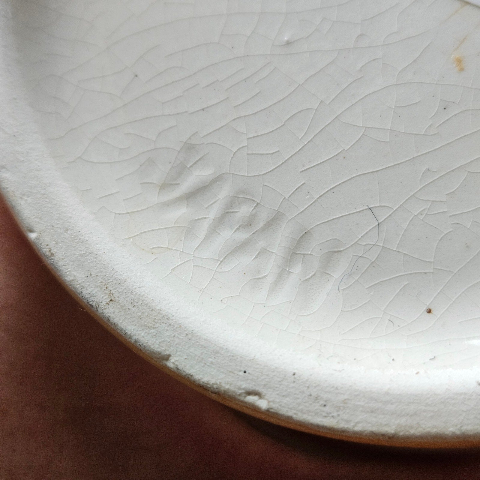 The glaze has developed fine, natural crazing throughout — a delicate crackle that softens the surface and gives it quiet age. The rim and pedestal base are finished in a warm ochre-toned banding that grounds the piece and adds subtle contrast against the ivory body.
