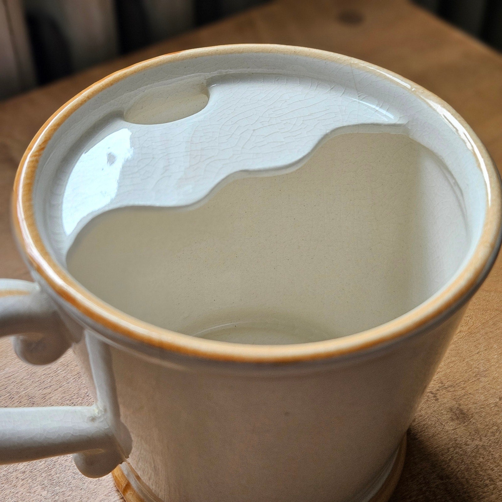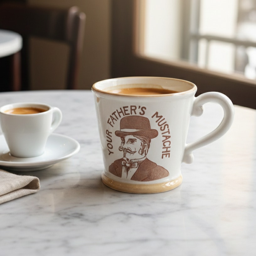 Inside, the sculpted mustache guard curves gently across the cup — a functional relic from a time when waxed mustaches required protection. Today, it serves as both a conversation detail and a design focal point.