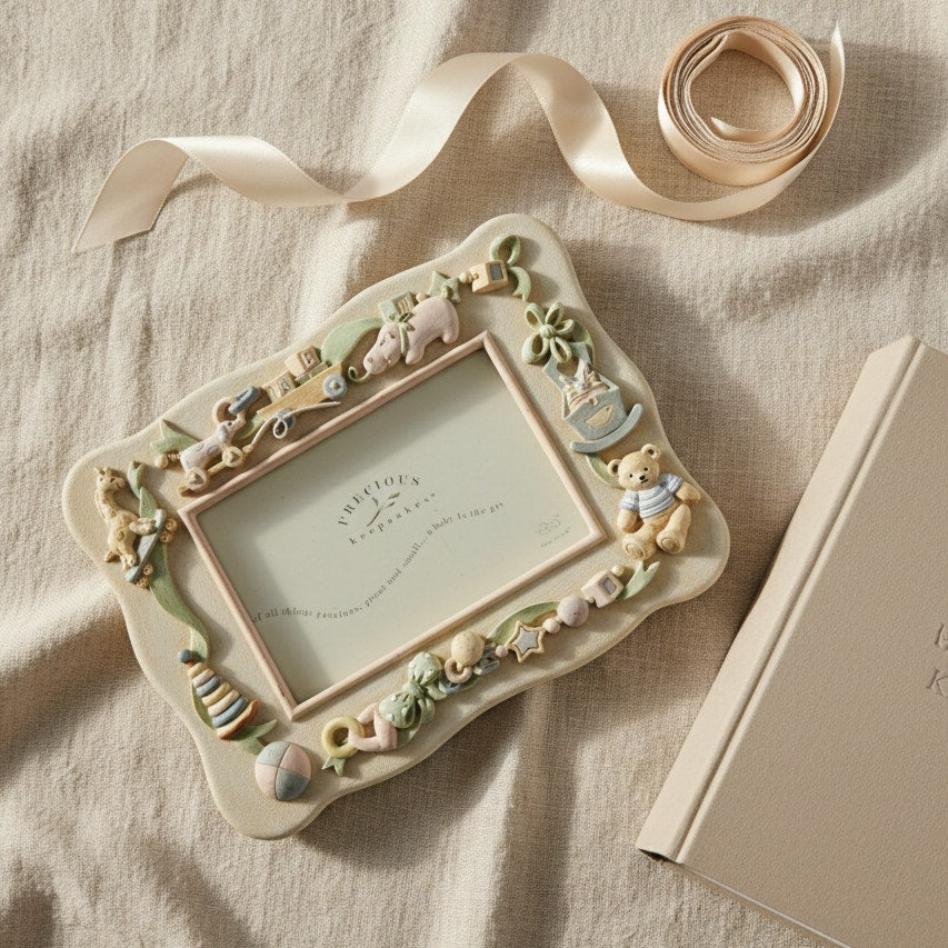 A softly nostalgic nursery frame from Russ Berrie’s Precious Keepsakes collection, featuring hand-painted pastel details and dimensional baby motifs.