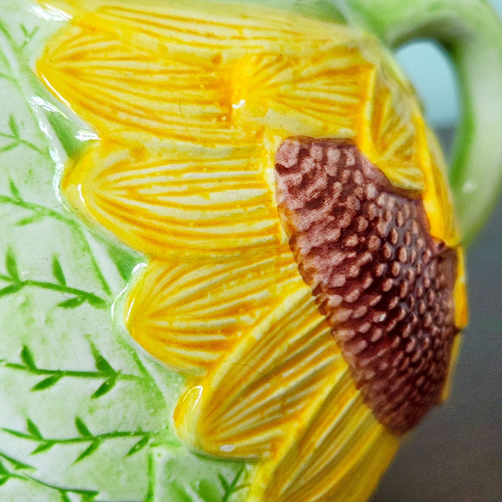 Charming vintage Seymour Mann sunflower teapot, hand-painted in vibrant yellow and green faience ceramic. This collectible piece features a bold sunflower design with a glazed finish, bringing a cheerful pop of color to any kitchen or tea collection. A true statement piece for sunflower lovers, vintage collectors, or those who enjoy unique kitchenware.