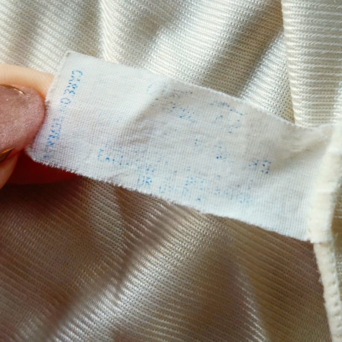 This piece features a softly structured bust, smooth nylon body, and adjustable straps. Lightweight with a subtle sheen, it layers effortlessly or stands alone as a minimalist vintage essential.