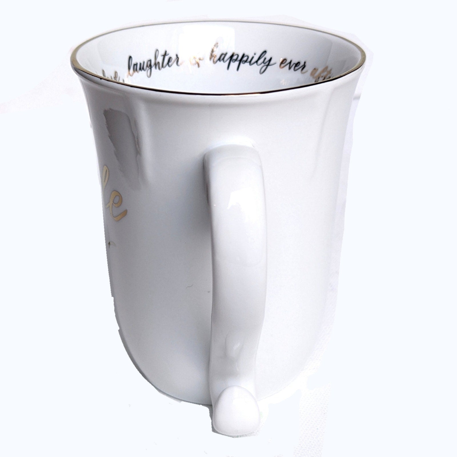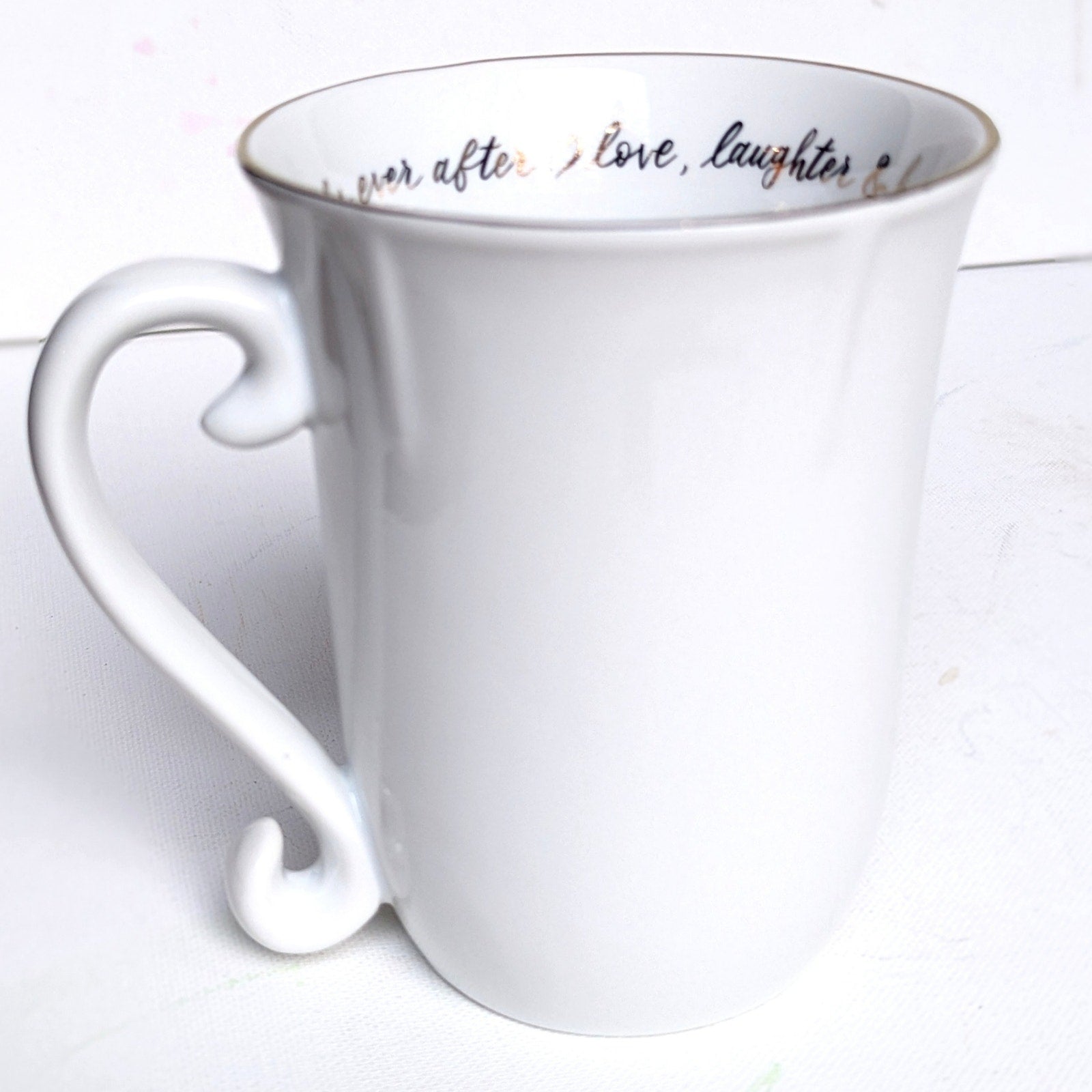 This elegant and discontinued Williams Sonoma porcelain coffee mug is perfect for a bride-to-be or as a thoughtful wedding-day gift. It features metallic gold script reading “bride xo” on the outside, with “love, laughter and happily ever after” scripted inside the rim.