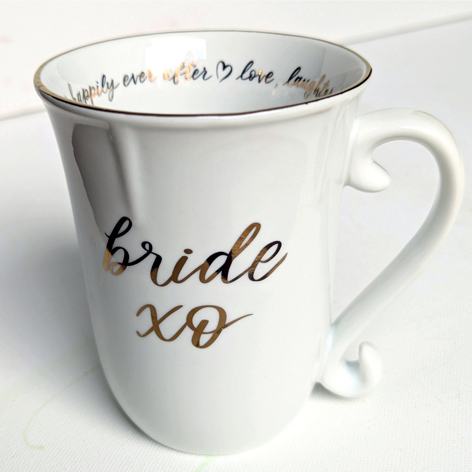 Williams Sonoma Mug, Bride XO Mug, Bridesmaid Gift Mug, Wedding Day Coffee Cup, Bridal Shower Gift, Metallic Gold Script Mug, Discontinued Williams Sonoma, Elegant Porcelain Mug, Collectible Wedding Mug, Bride To Be Gift